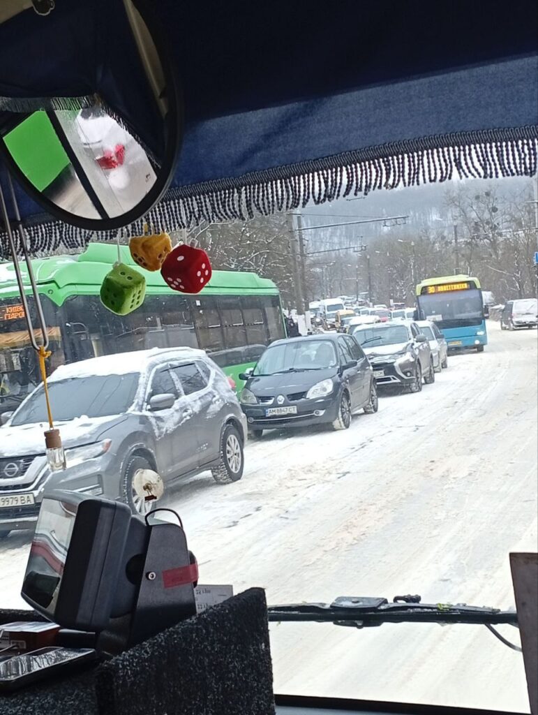 Найгостріша ситуація зранку була на Чуднівському мосту. Підйом у напрямку центру перетворився на пастку: автівки буксували, утворився затор, фактично стояли Корбутівка і Мальованка. Люди штовхали машини, ризикуючи власною безпекою.