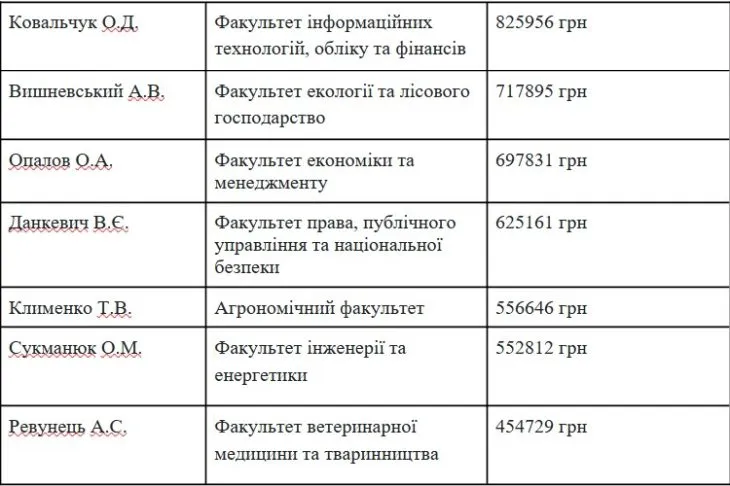 Одразу кидається в око різниця виплат майже в два рази від лідера отриманого доходу за 2025 рік декана Ковальчука О.Д. в порівнянні з найображенішим, але водночас найвольовішим факультетом ветеринарної медицини та тваринництва. Даний факультет завжди був в опозиції до діючої адміністрації та більшість науковців факультету не розділяють рішення та порядки чинного т.в.о. ректора.