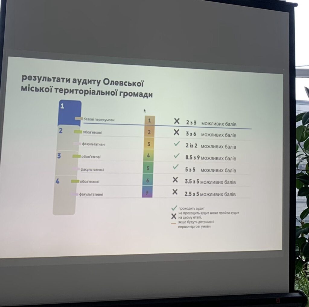 За словами регіональної консультантки «ОПОРИ» Ірини Кирилович, дослідження в Олевській громаді тривали з серпня по жовтень і були спрямовані на перевірку соціально-економічних чинників, які сприятимуть проведенню повоєнних виборів. Аудит проводили за 4 блоками по 35 критеріям. У результаті їх вивчення отримали гарні показники в соціально-економічному блоці, однак у блоках «Безпека» та «Демократичні процеси» були виявлені недоліки. Перший блок «Базові передумови початку аудиту» передбачає: скасування правового режиму воєнного стану, контроль громади українською владою та відсутність обстрілів мінімум 3 місяці, тому жодна з досліджувальних громад держави його не виконала.