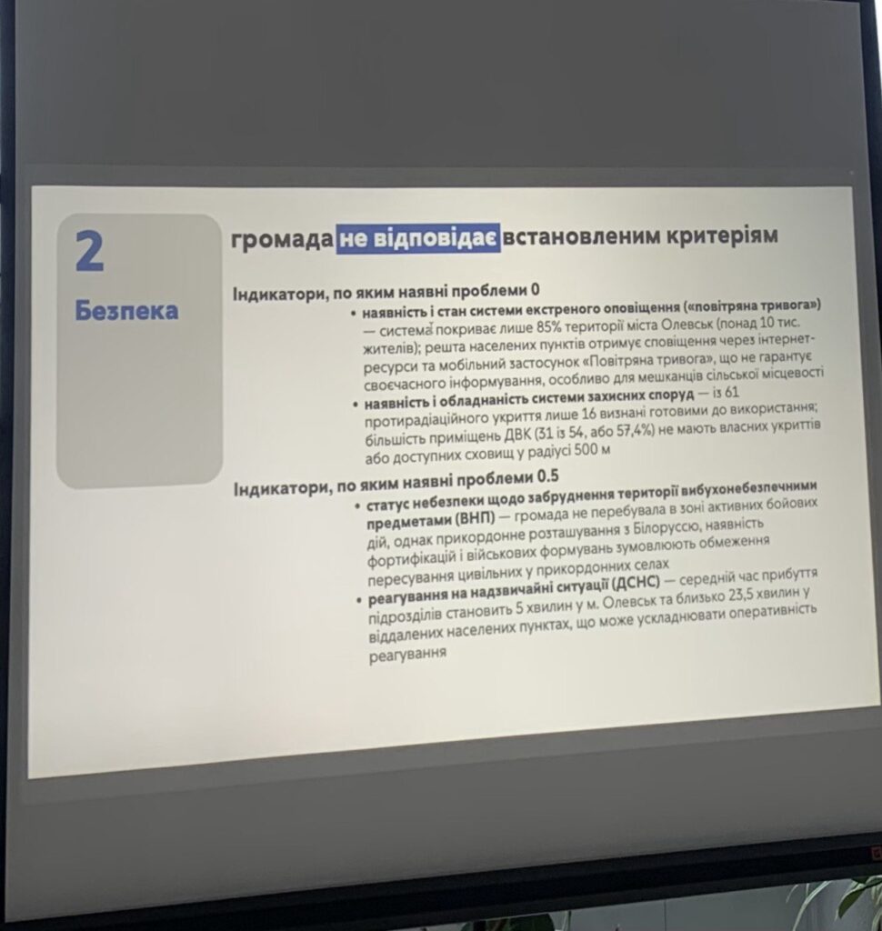 — Говорячи про Олевську громаду, — розпочала виступ Ірина Кирилович, —вона не пройшла аудит у блоках «Безпека» та «Демократичні процеси». У системі безпеки, ми виявили недопрацювання в оповіщенні повітряних тривог. Система оповіщення знаходиться в місті Олевськ і охоплює всього 85% населення, це близько 10 тисяч людей, а загалом у громаді проживає 34 тисячі. Тому наші рекомендації — вдосконалити систему оповіщення, особливо це стосується прикордонних сіл, де населення отримує сповіщення через додаток «Повітряна тривога». Ще один критерій, за яким громада отримала нижчу оцінку, це укриття. За даними ДСНС в громаді налічується 61 протирадіаційне укриття з них лише 16 придатні до перебування населення. Тому в цьому критерії ми рекомендуємо теж доопрацювати, — каже регіональна консультантка. — У блоці «Демократичні процеси» негативну оцінку теж отримали укриття. В громаді є 54 приміщення, в яких розміщені виборчі комісії, і в 31 з них не має укриттів в самому приміщенні або в радіусі 500 м. біля. Якщо говорити про роботу в громаді політичних партій, то в моніторинговий період вони активної діяльності не проводили. Теж саме стосується і громадських організацій. Є поодинокі волонтерські ініціативи, — розповіла Ірина Кирилович.