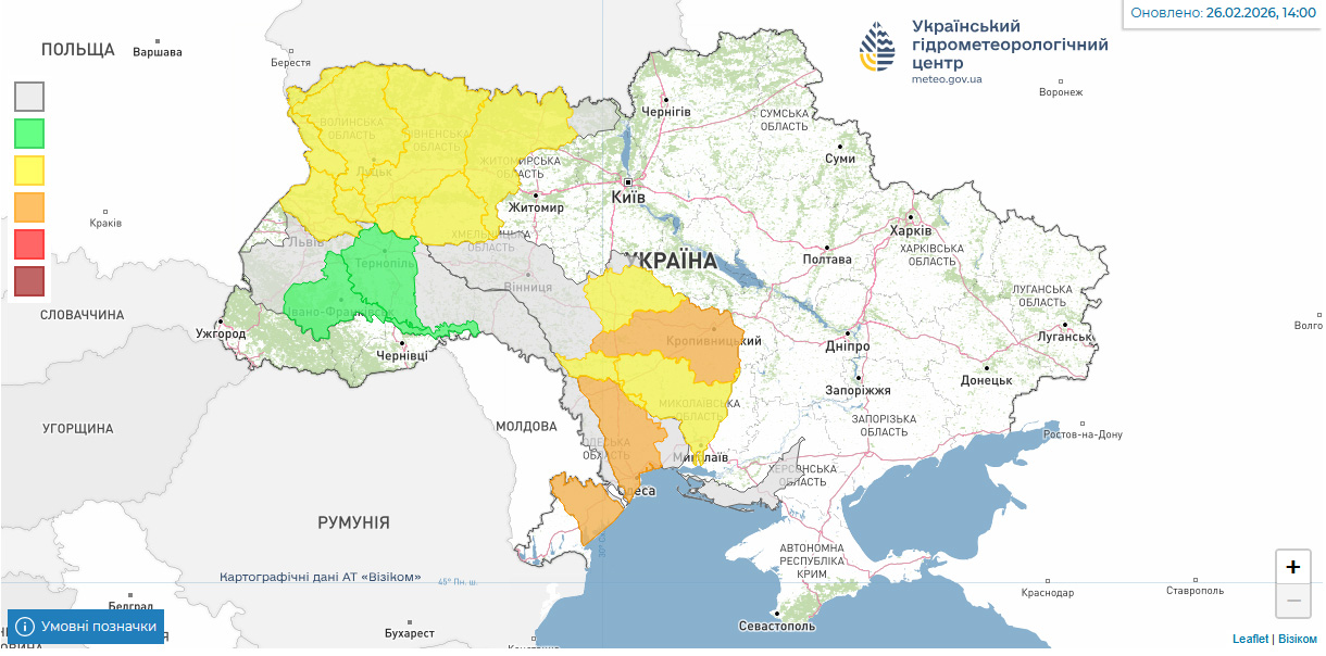 Мiсцями можливий початковий вихiд води на заплаву (І рівень небезпеки – жовтий).