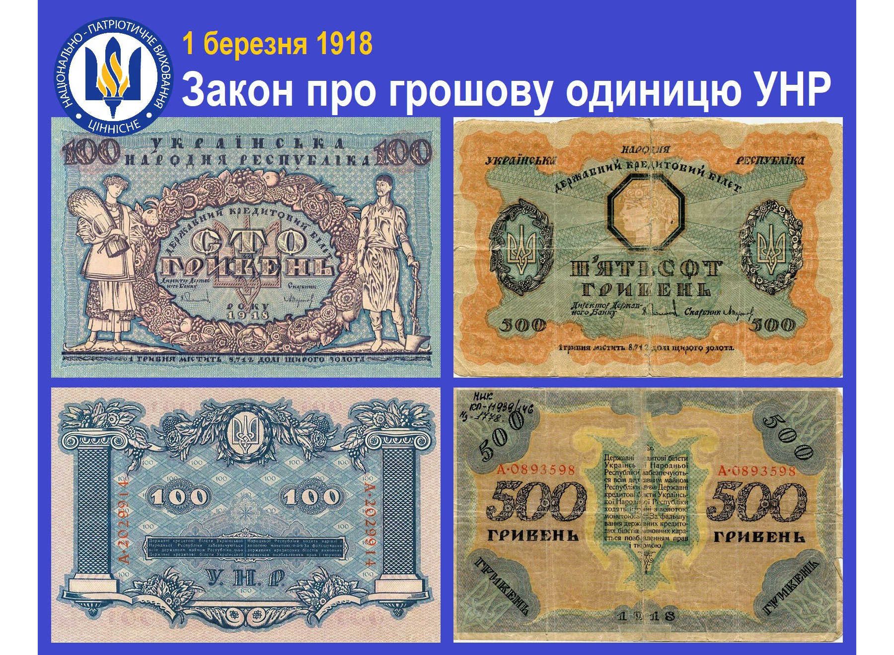 1 січня 1918 Центральна Рада ухвалила «Тимчасовий закон про випуск державних кредитових білетів УНР». Першими українськими грошима стали банкноти «100 карбованців», оформлені художником-графіком Георгієм Нарбутом.