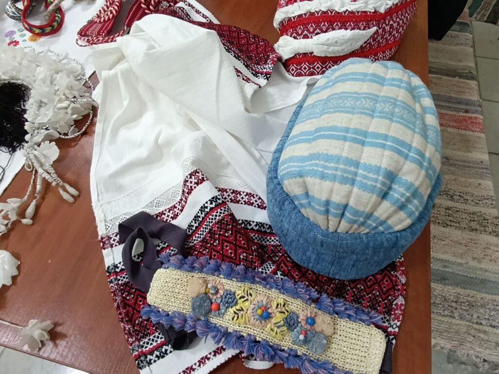 Анна Івченко натхненно розповідала про кожен експонат з окремої експозиції «Головні убори». Розпочала з солом’яного капелюха, роботи подружжя майстрів Олексія і Анни Пшеничнюків. Говорячи про хустки, екскурсовод розказала про популярні у заможних жінок «тернові», назва яких пішла від заводу виробника, вони великі, з натуральної вовни, тому мало збереглися.