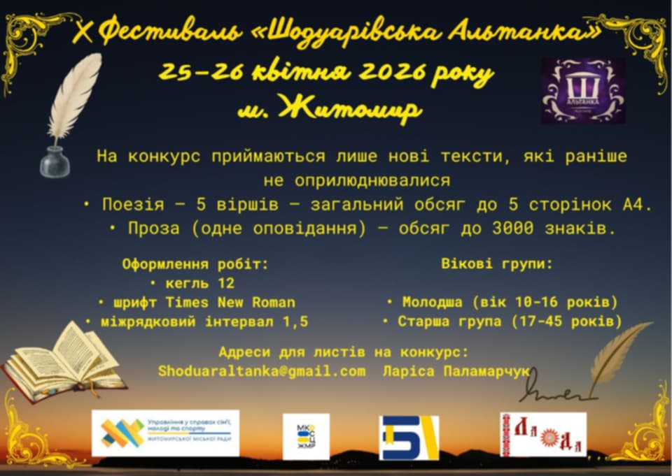 Х Всеукраїнський літературно-мистецький фестиваль «Шодуарівська Альтанка» запрошує до участі в ювілейному конкурсі! Організаторка фестивалю Ларіса Паламарчук оголошує прийом робіт на десятий, знаковий фестиваль, що відбудеться 25–26 квітня 2026 року в Житомирі.