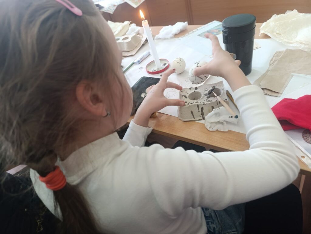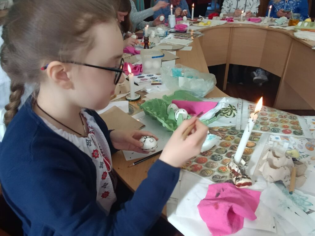 — Я сьогодні розмалювала яйце, намалювала сердечко, хрестики, а ще крапочки. Одне яєчко я залишу собі на пам’ять, а друге подарую мамі. Мені сьогодні сподобалося працювати з сестричкою, я буду розписувати писанки, а ще хочу навчитися в’язати — каже Діана.
