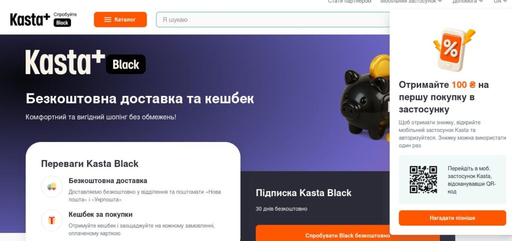 Крім можливості обрати товар за ціною, яка вам підходить, від виробника, якому ви більше симпатизуєте, ви ще можете отримати безкоштовну доставку. Для цього варто лише отримати підписку Kasta Black. Для того, щоб не пропустити новинки та акції маркетплейсу, рекомендуємо встановити мобільний застосунок та включити сповіщення від додатку, які повідомлятимуть про новинки та акції.