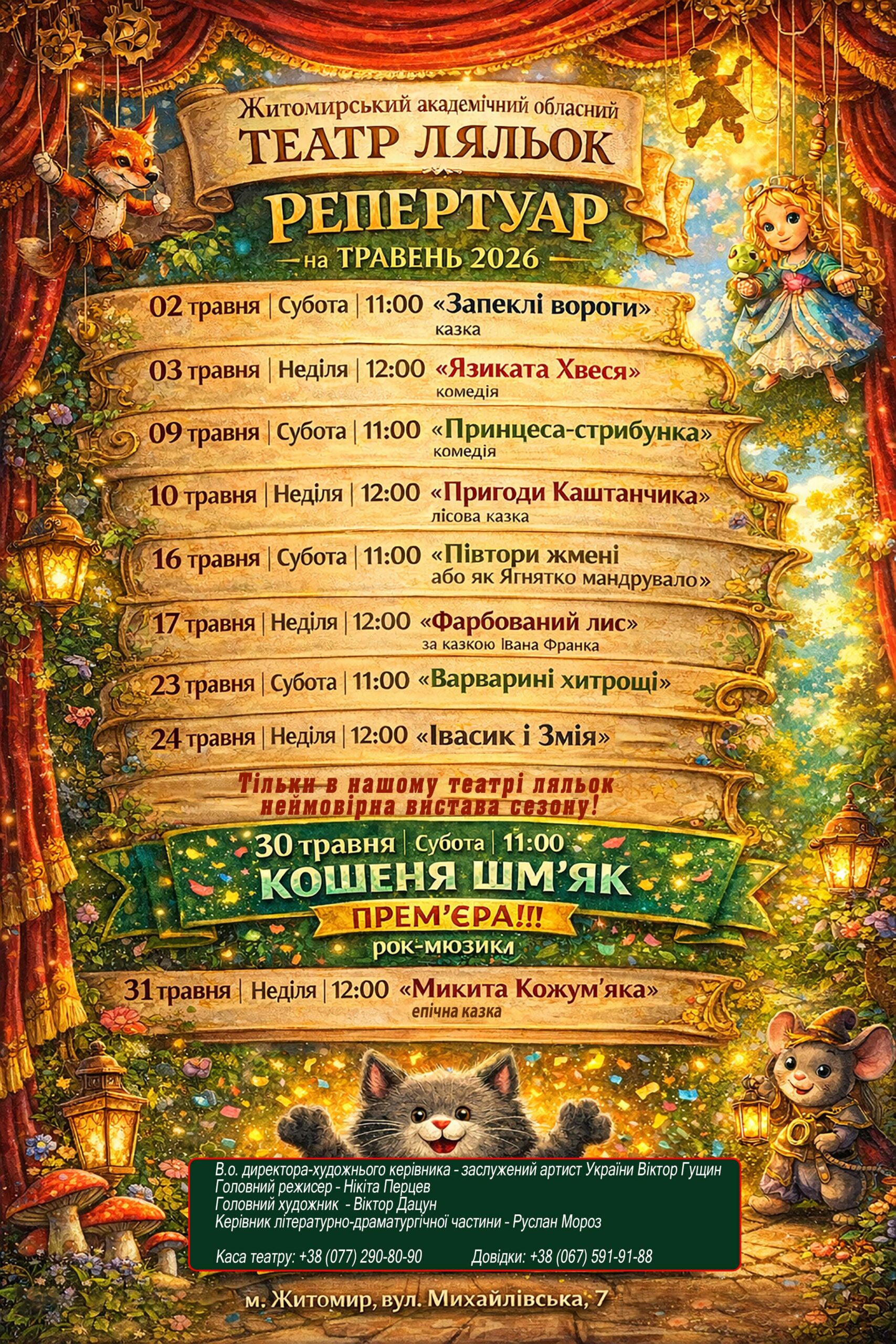 Травень 2026 року обіцяє стати справжнім святом для дітей і дорослих. Житомирський академічний обласний театр ляльок підготував насичений репертуар, у якому поєдналися народні казки, сучасні постановки, комедії та велика прем’єра. Це чудова нагода провести вихідні разом із родиною, занурившись у світ театральної магії.