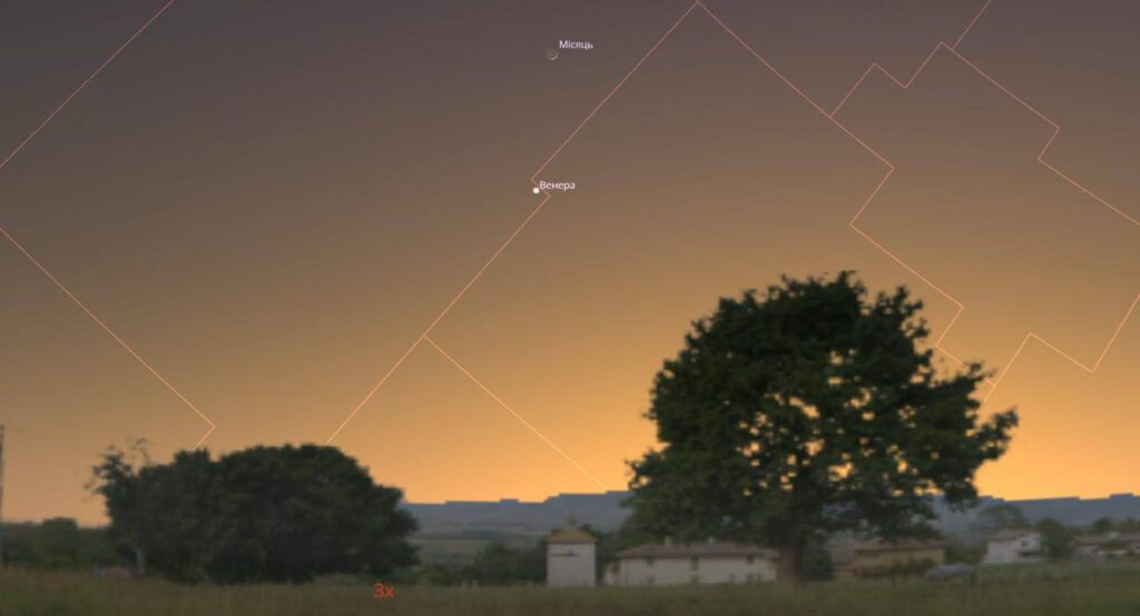 Перше явище — дуже видовищне і привертає увагу навіть далеких від астрономії людей. Момент сполучення припадає на 08:13 (за Києвом), що, вочевидь, для нас не надто зручно спостерігати. Однак і ввечері серпик Місяця все ще перебуватиме достатньо близько до Венери.