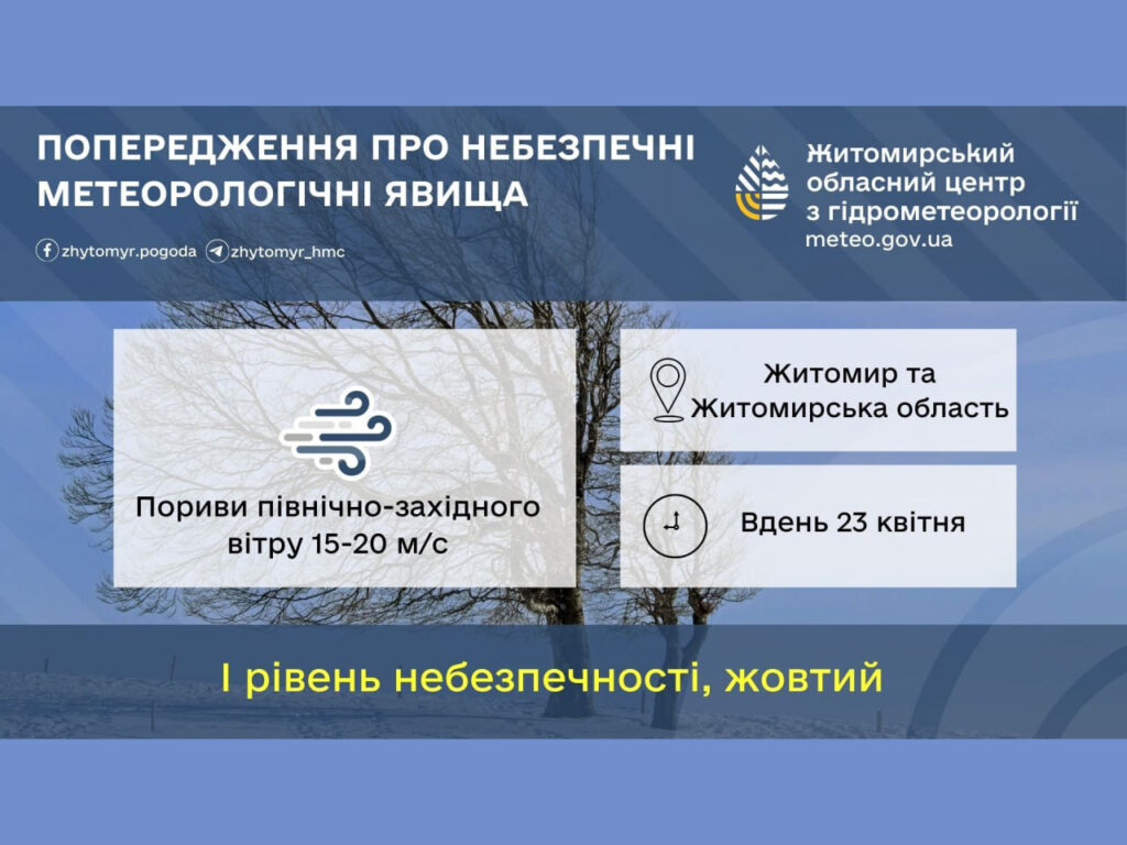 Вдень 23 квітня у Житомирі та Житомирській області пориви північно-західного вітру 15-20м/с. (І рівень небезпечності – жовтий)