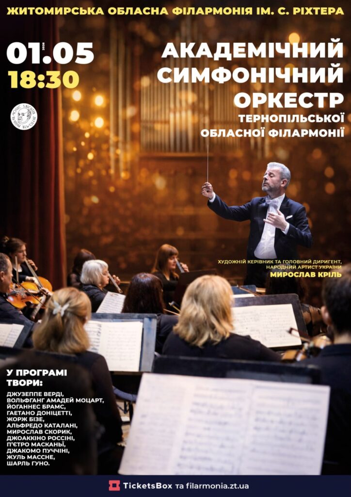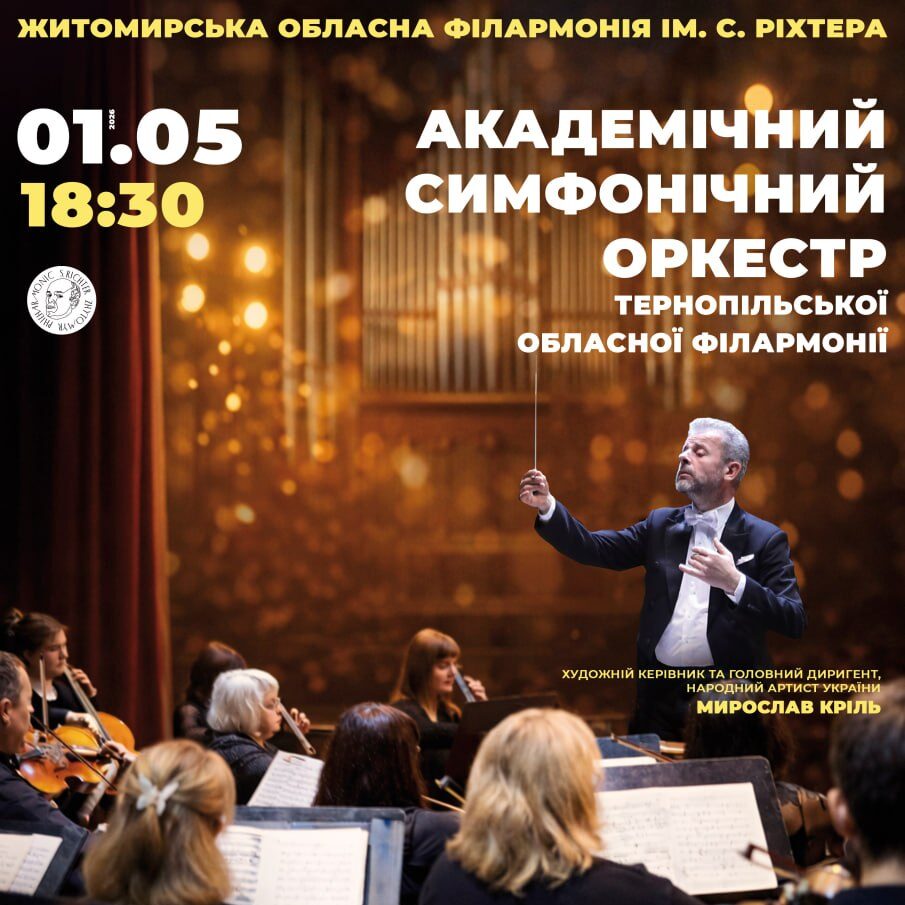 Житомирська обласна філармонія ім. С. Ріхтера запрошує 1 травня о 18:30 на концерт Академічного симфонічного оркестру Тернопільської обласної філармонії під керівництвом народного артиста України Мирослава Кріля.